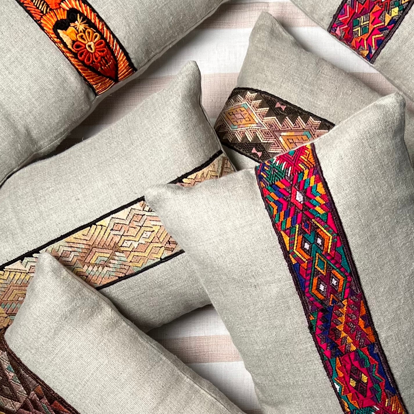 OUR AFGHAN FRIENDS arrived in Greensboro, North Carolina in 2021 from Afghanistan, fleeing the country as refugees when the Taliban resumed power. We cannot use their names because some family members remain in Afghanistan. In Greensboro, they have quickly adjusted to their new lives and have found various jobs to provide additional support to their family. They use their expert seamstress abilities to assemble Intertwined's mixed-textile pillows, combining fabrics (vintage and new) from various countries with our signature hemp fabric.