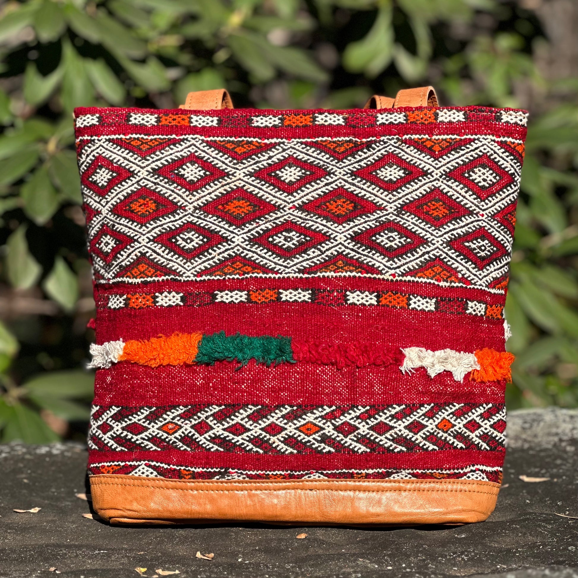 Moroccan sustainably sourced, vegetable tanned leather and wool vintage kilim