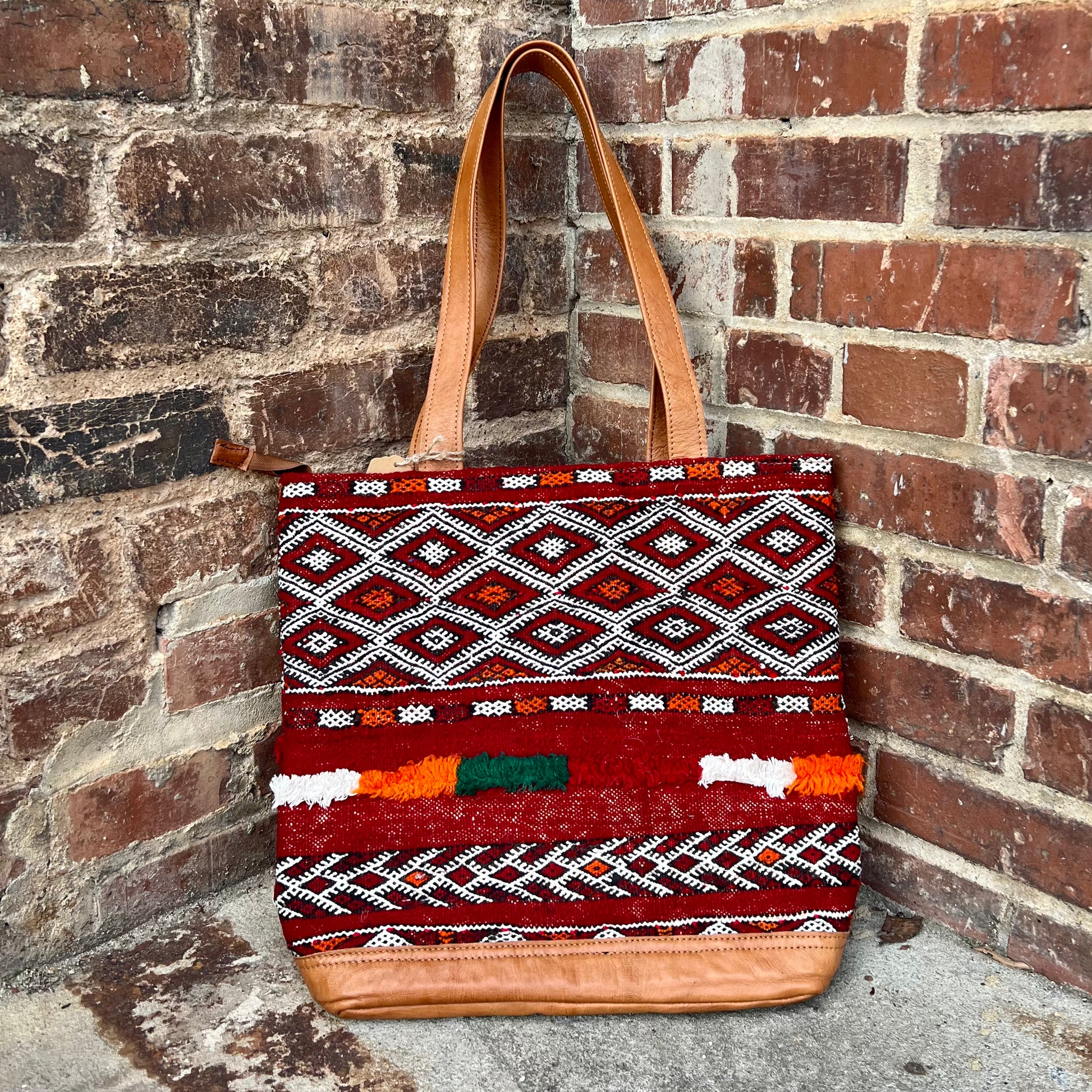 Intertwined's beautifully crafted tote bag is handmade in Morocco from locally tanned leather and vintage, handwoven kilim. Each kilim is one-of-a-kind and handwoven with unique colors and patterns based on the region where it is made. This bag combines style and function! Several of our kilim totes also coordinate with our kilim weekenders so you will truly be traveling in style!