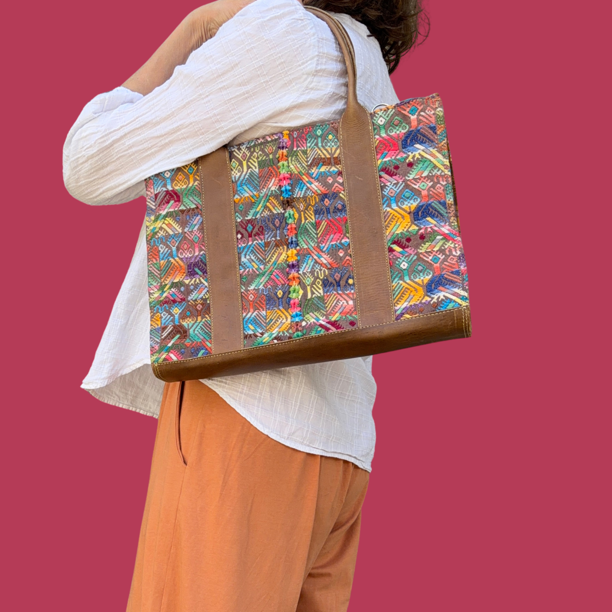 At Cuero Malec, a Guatemalan leather workshop, skilled artisans carefully transform these vintage textiles into sturdy, beautifully constructed bags. The result is a striking blend of traditional craftsmanship and modern design—an artisan tote that celebrates heritage while giving new life to extraordinary handwoven fabric.