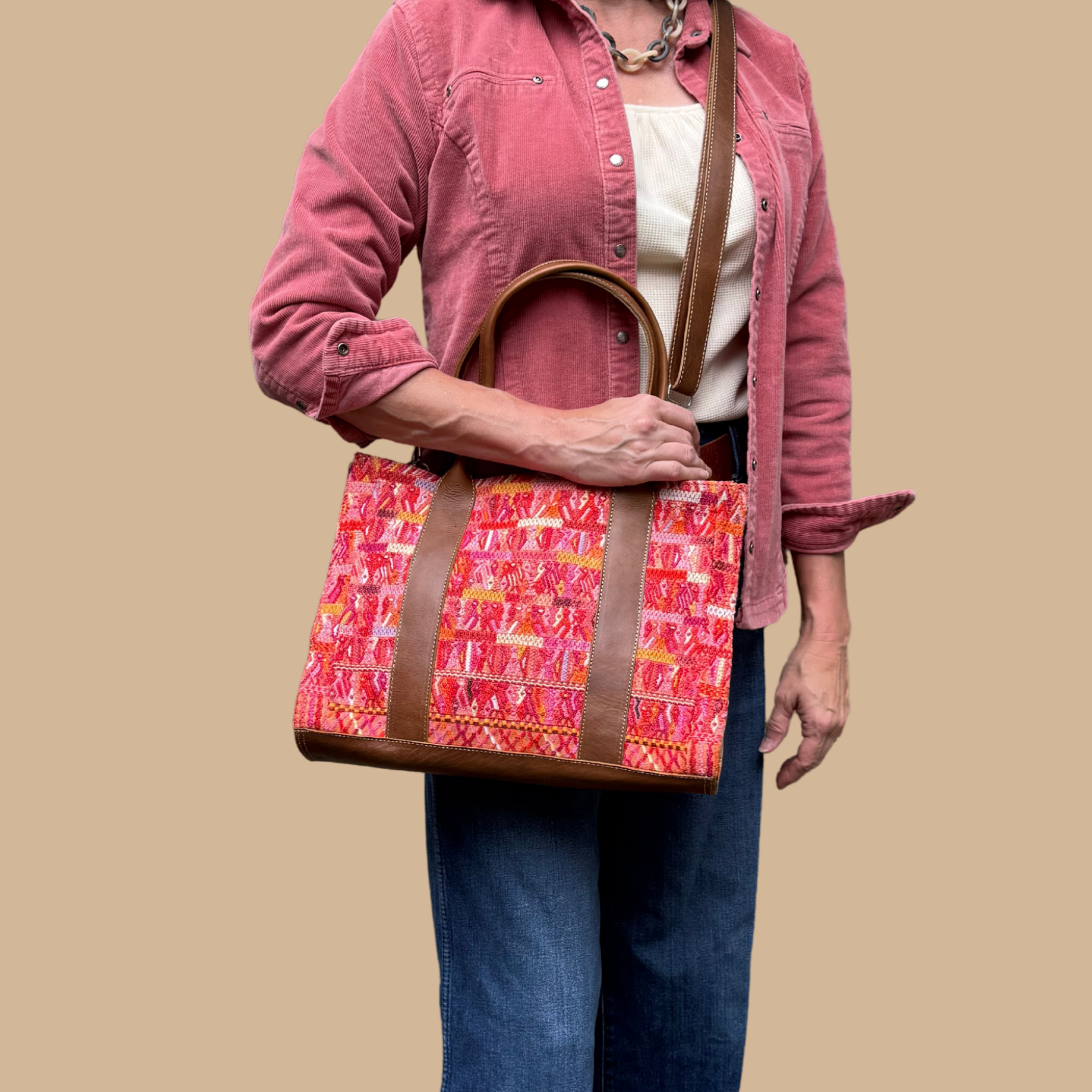 Intertwined's huipil tote bag is sustainably crafted from a repurposed huipil, a handwoven blouse worn by Mayan women in Guatemala. Cuero Malec, a Guatemalan leather shop, upcycles these huipiles by creating stunning, sturdy, handmade artisan bags. It's a unique fusion of classic design and contemporary eco-fashion! The tote can be expanded with side snaps and an adjustable crossbody strap adds even more versatility. The interior is lined with handwoven fabric as well, and a top zipper keeps everything safe!