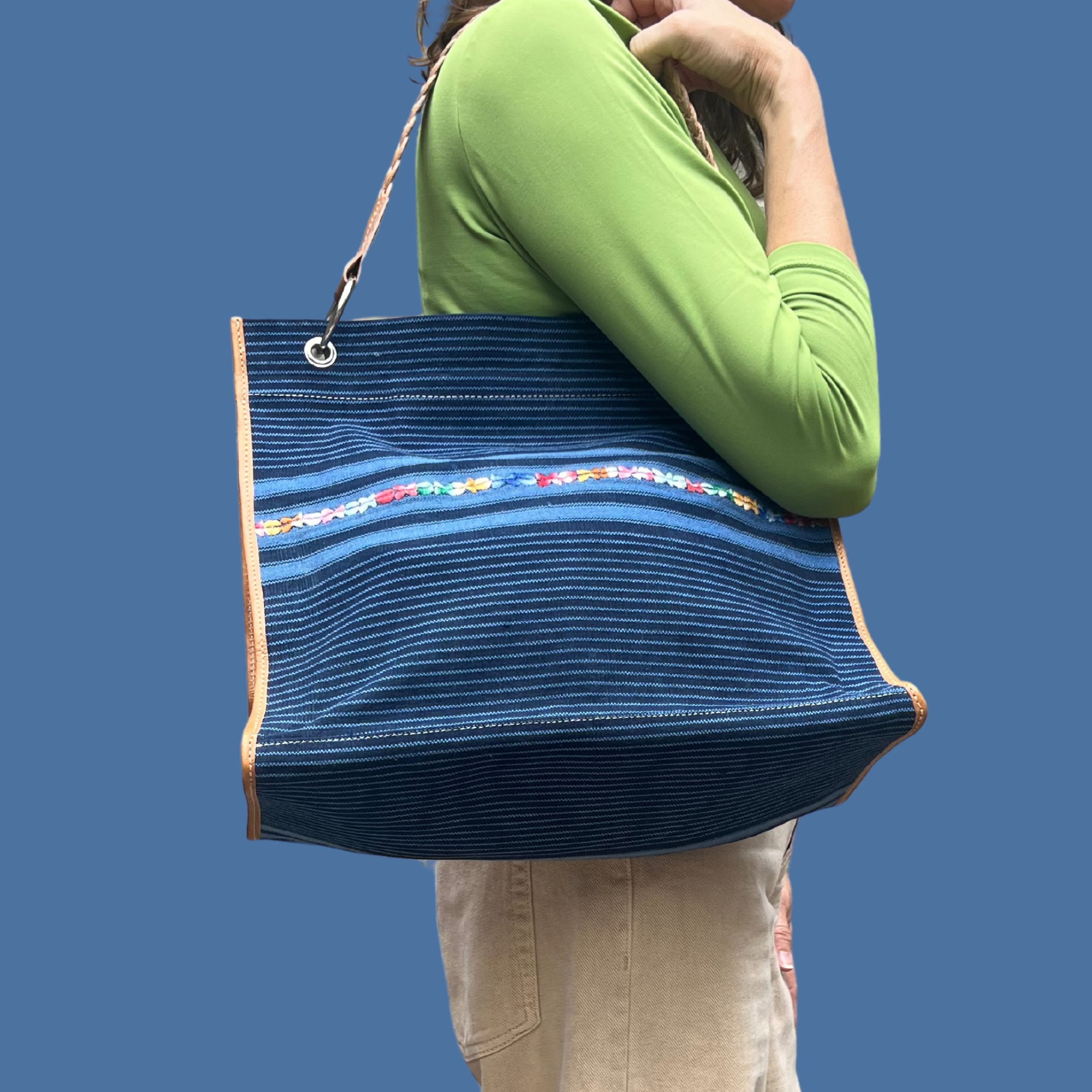 This isn't your average denim! It's actually handcrafted and has a rich past as a traditional Mayan skirt from Guatemala. The hand-embroidery adds a pop of color, and it's skillfully made by artisans at Cuero Malec, with vegetable-tanned leather accents including a hand-braided leather strap. Inside, you'll find different type of handwoven fabric (jaspe), along with a handy slot pocket and zipper pocket. Great for everyday!
