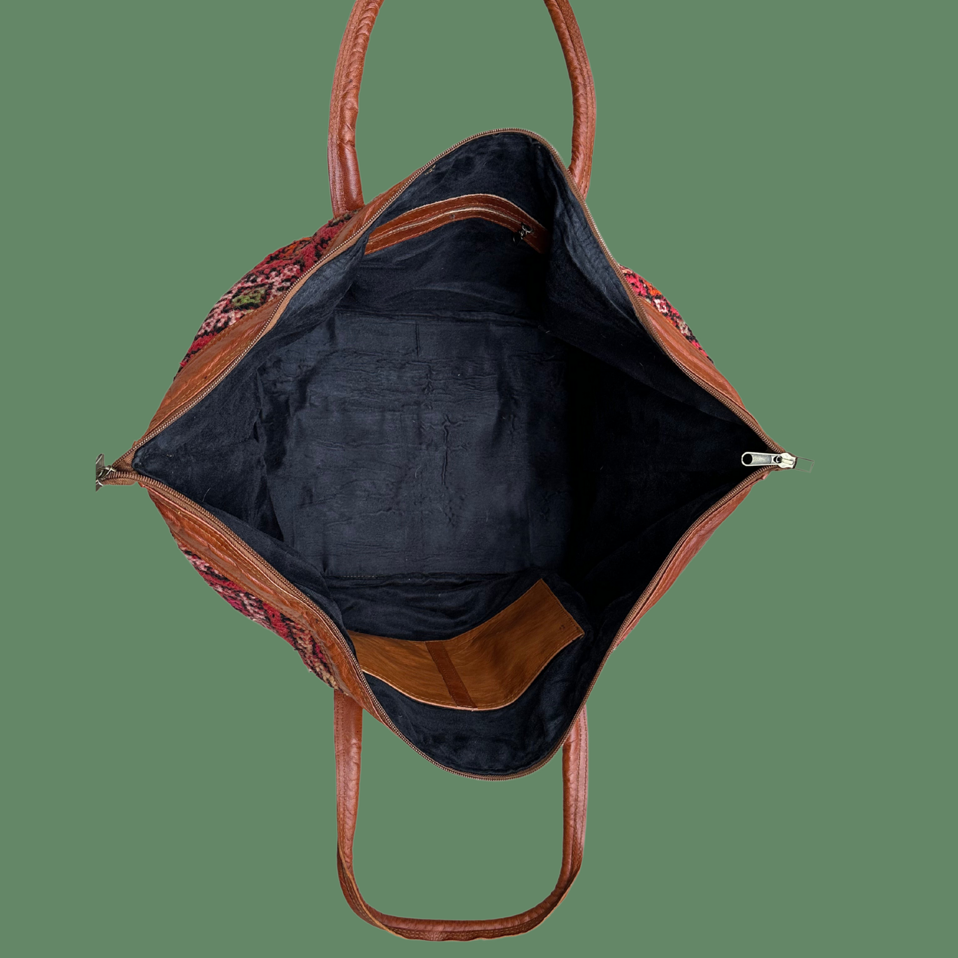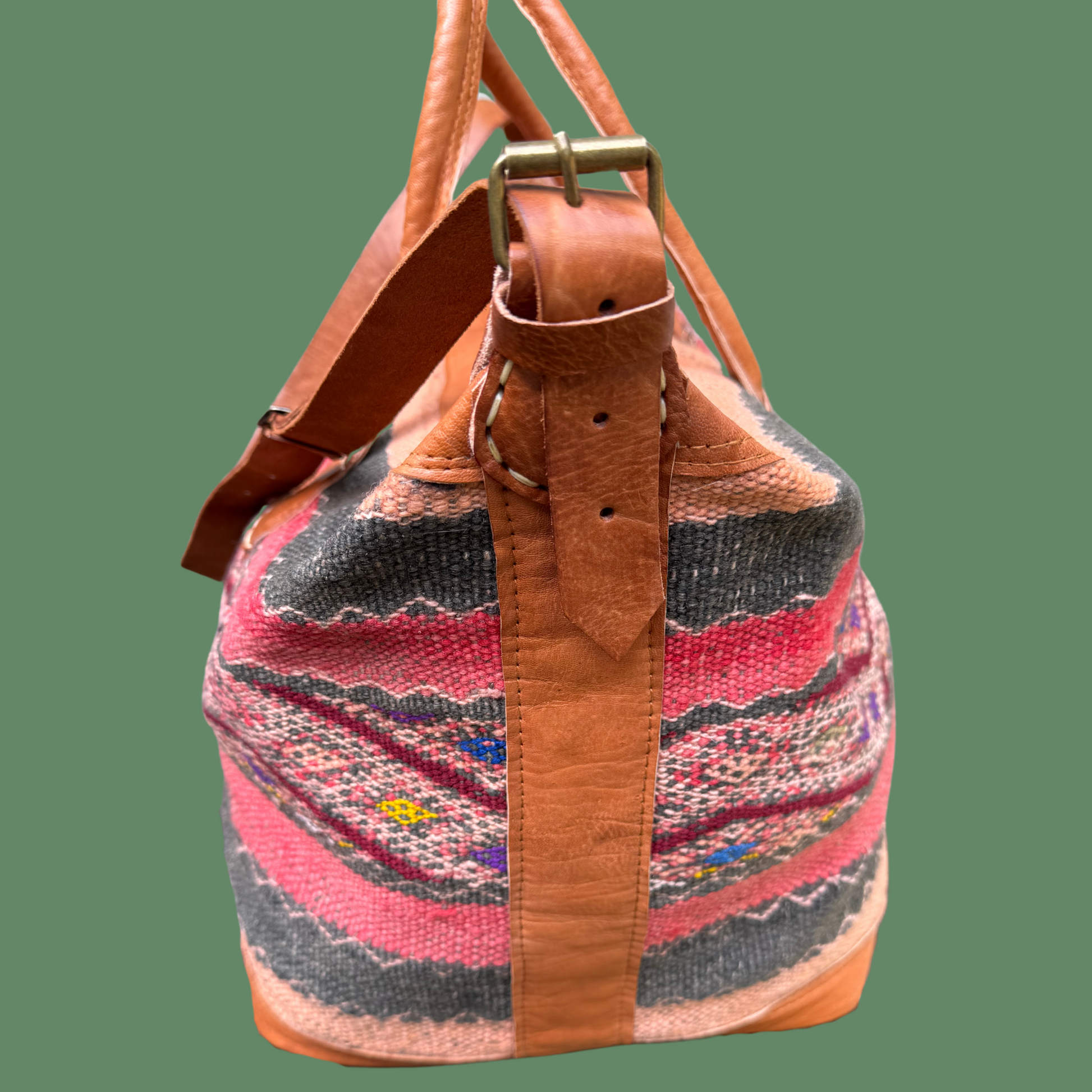 Handcrafted in Morocco by skilled artisans, this stylish and durable weekender bag features sustainably sourced, vegetable-tanned Moroccan leather paired with vibrant vintage kilim—each handwoven with distinctive patterns and colors that reflect the cultural heritage of its region. No two bags are the same, making yours truly unique.