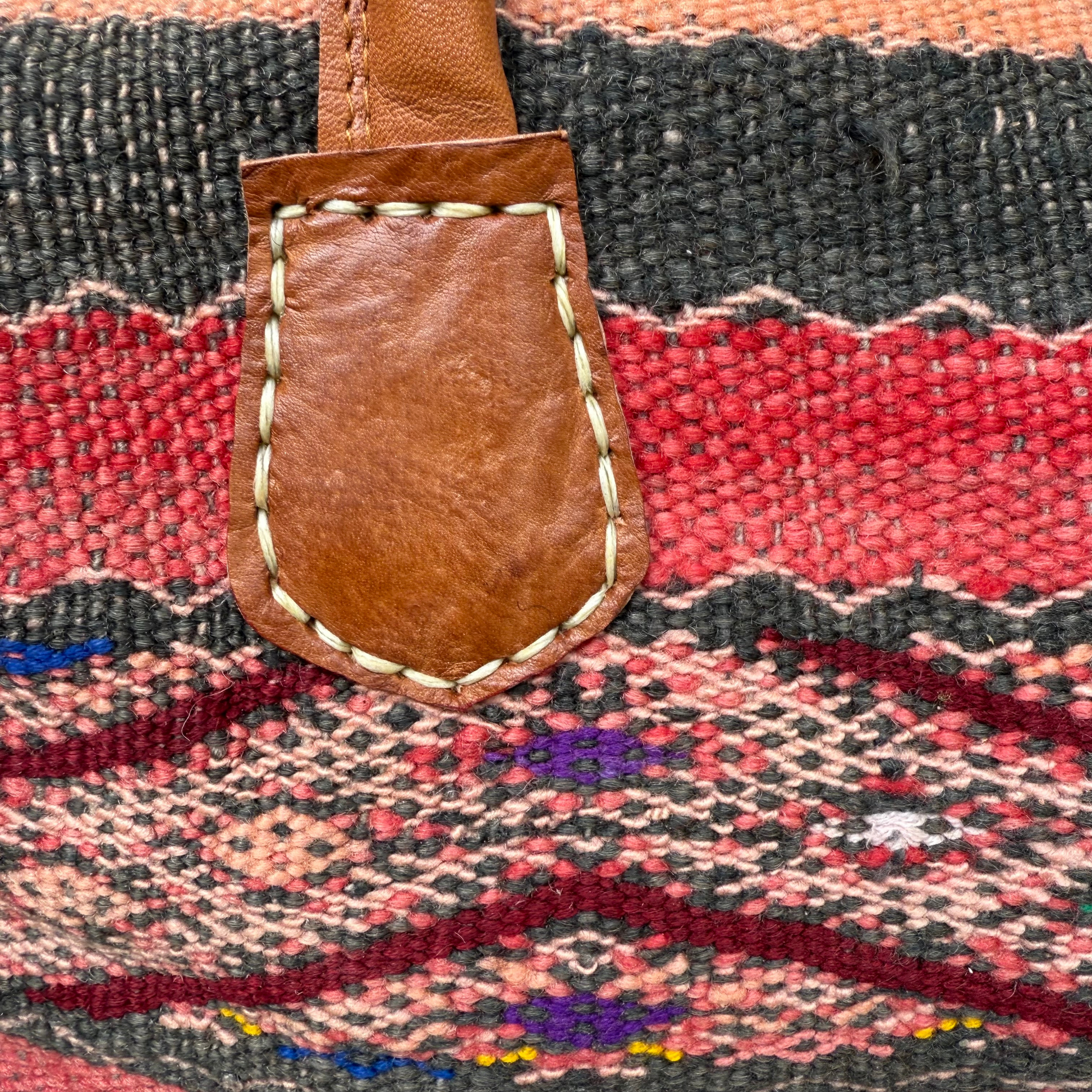 Moroccan sustainably sourced, vegetable tanned leather and wool vintage kilim.