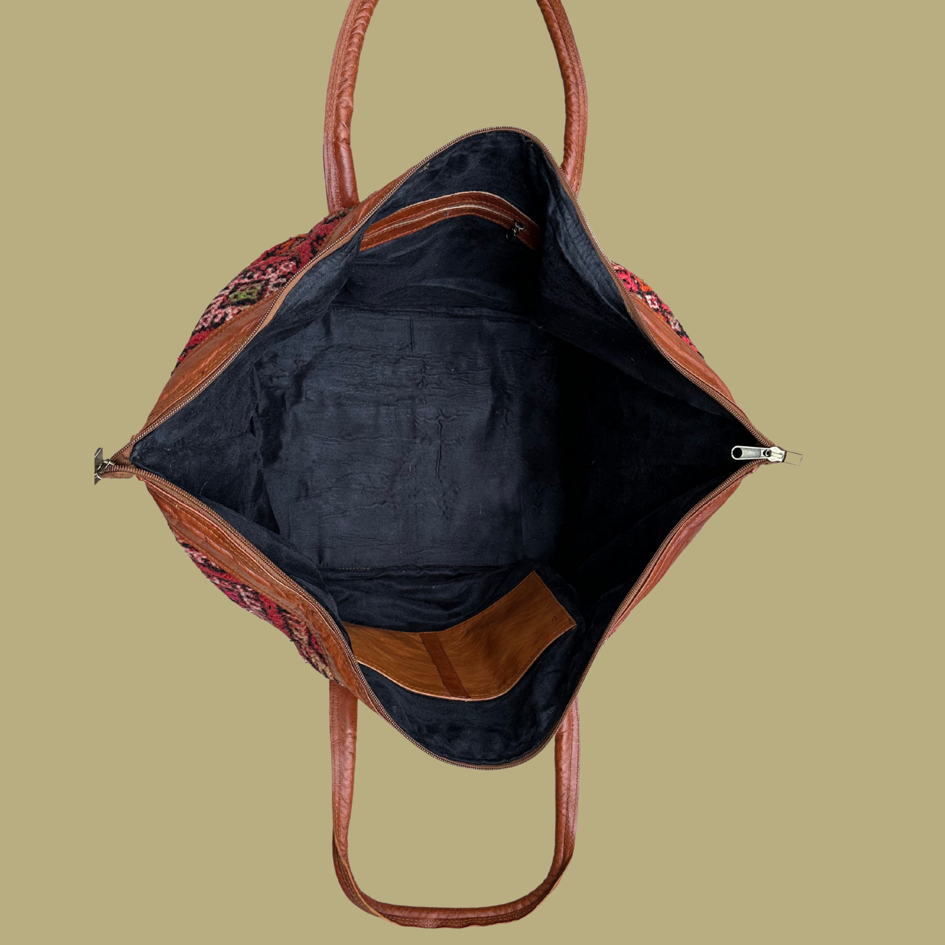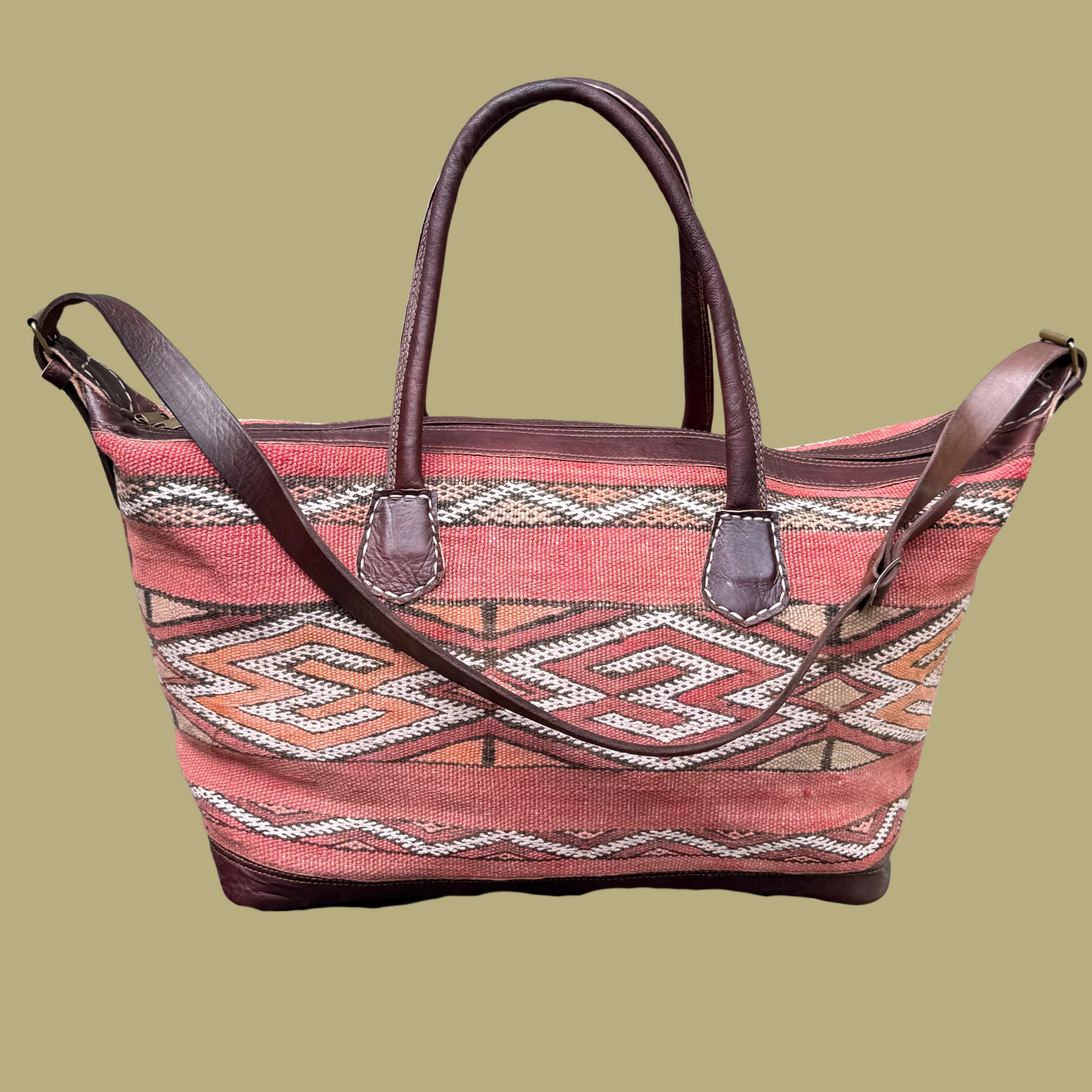 Handcrafted in Morocco by skilled artisans, this stylish and durable weekender bag features sustainably sourced, vegetable-tanned Moroccan leather paired with vibrant vintage kilim—each handwoven with distinctive patterns and colors that reflect the cultural heritage of its region. No two bags are the same, making yours truly unique.