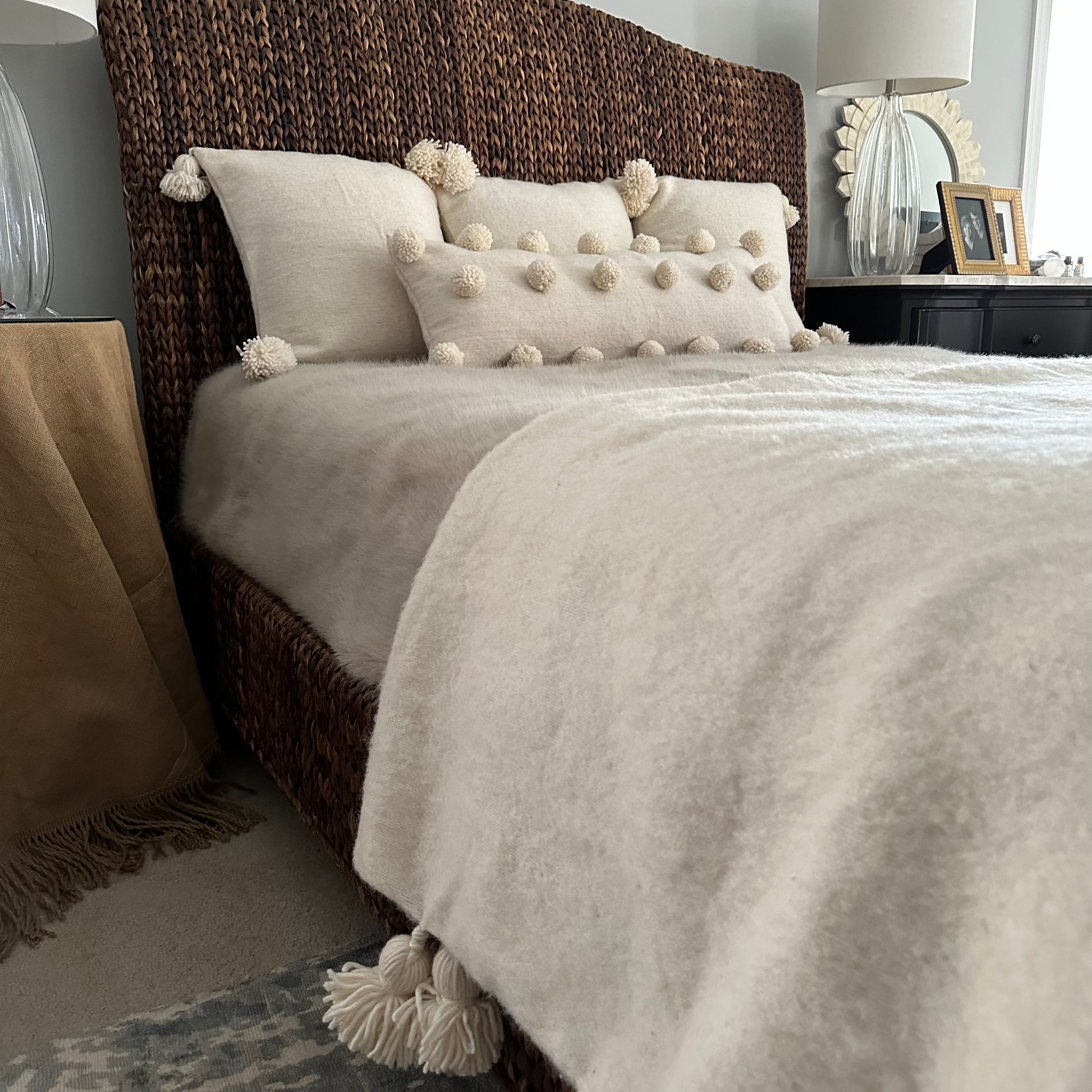 Warmth and style, all woven together! Intertwined's beautifully thick 100% wool blankets are woven in Morocco by hand on traditional wooden looms, using a centuries old technique passed down from generation to generation. The wool in these blankets is processed by hand, and thus, you may find some organic matter in the weave which only enhances their beauty. The wool only gets softer with age.